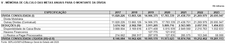 Art. 1.º A Dívida Pública Consolidada, a Dívida Consolidada Líquida e a memória de cálculo das metas anuais para o montante da Dívida, constantes no Anexo I - Anexo de Metas Fiscais, da Lei n.º 17.278, de 11 de setembro de 2020, passam a vigorar na forma do Anexo Único desta Lei.