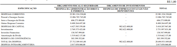 Art. 3.º A Despesa Orçamentária no mesmo valor da Receita Orçamentária é fixada em R$ 28.694.931.849,00 (vinte e oito bilhões, seiscentos e noventa e quatro milhões, novecentos e trinta e um mil, oitocentos e quarenta e nove reais), na forma dos Anexos II, III e IV e com o seguinte desdobramento: